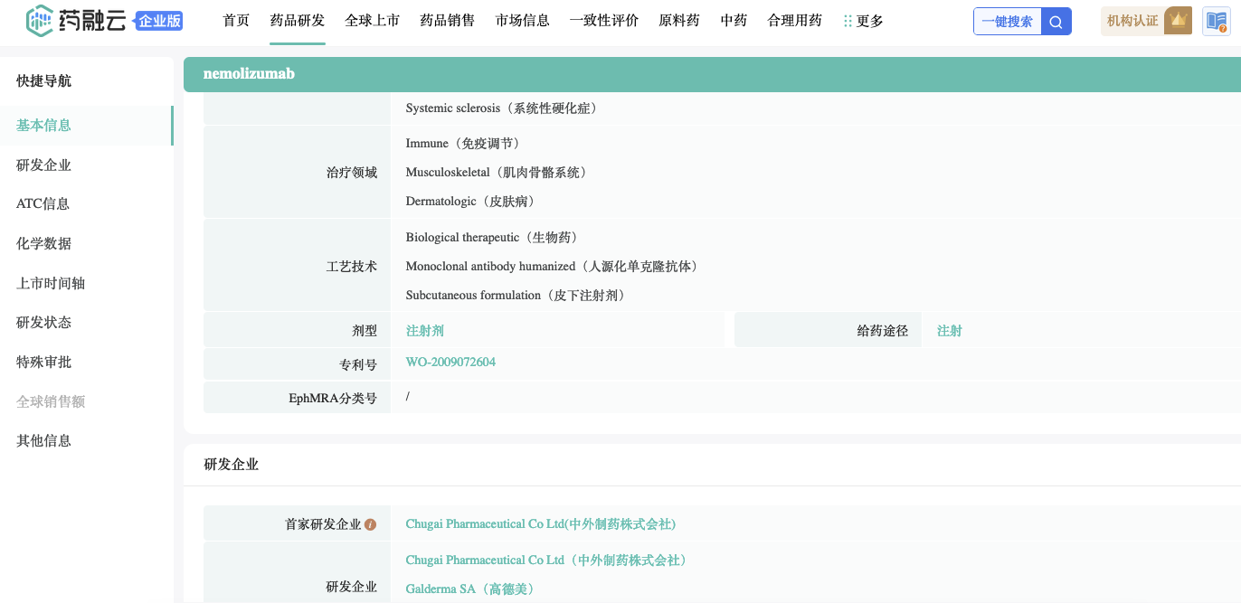 药融云数据显示:Maruho拥有权益nemolizumab日本权益。高德美(Galderma)拥有除日本和中国台湾省之外的权益。Nemolizumab由中外制药的抗体工程技术ACT-Ig开发,ACT-Ig可延长抗体在血液中的半衰期。抗体相关专利:WO-2014208645。