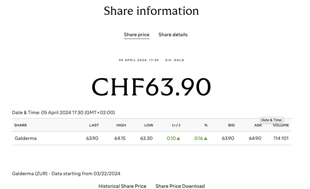 这是2017年以来瑞士最大规模IPO。高德美(股票代码为"GALD")开盘价为每股61.00瑞士法郎,当时市值高达145亿瑞士法郎(约合人民币1164亿元)。高德美已发行股本包括 237,897,635 股登记股,其中 37,233,708 股新发行登记股和 276,909 股现有登记股在首次公开募股中发行。按每股登记股 53.00 瑞士法郎的发行价计算,配售量约为 20 亿瑞士法郎(不包括超额配售权)。此外,作为超额配售权的一部分,股东们还发售了最多 5,626,592 股现有登记股票,这些股票可在瑞士证券交易所首个交易日后的 30 个日历日内行使超额配售权。
