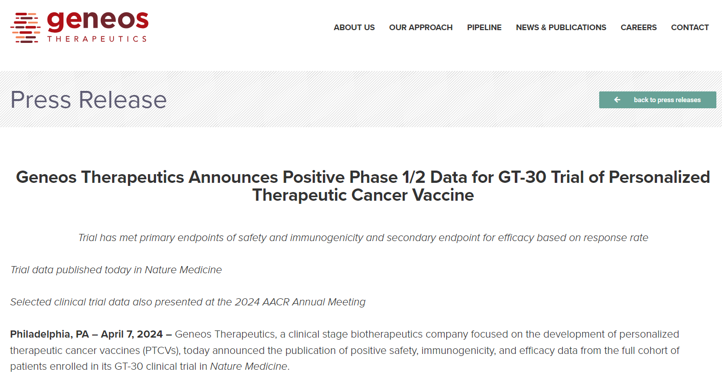 2024年4月7日,个性化癌症疫苗公司Geneos Therapeutics发布公告:其 DNA 疫苗GNOS-PV02与免疫药物pembrolizumab治疗晚期肝细胞癌患者的1/2期试验数据,ORR达到30.6%。