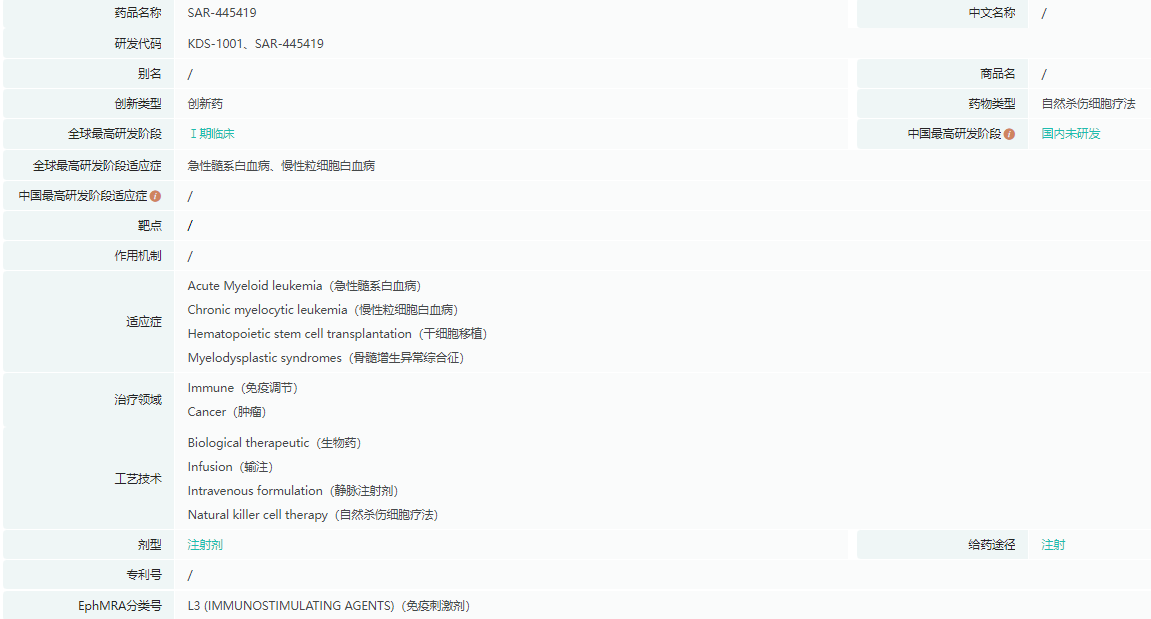 这一举措是在近日更新SAR445419临床试验信息时悄悄公布的。SAR445419是赛诺菲研发的一种异基因NK细胞疗法,用于治疗复发/难治性急性髓系白血病。根据美国临床试验数据库信息,SAR445419第一阶段研究因Kiadis的撤资而终止。