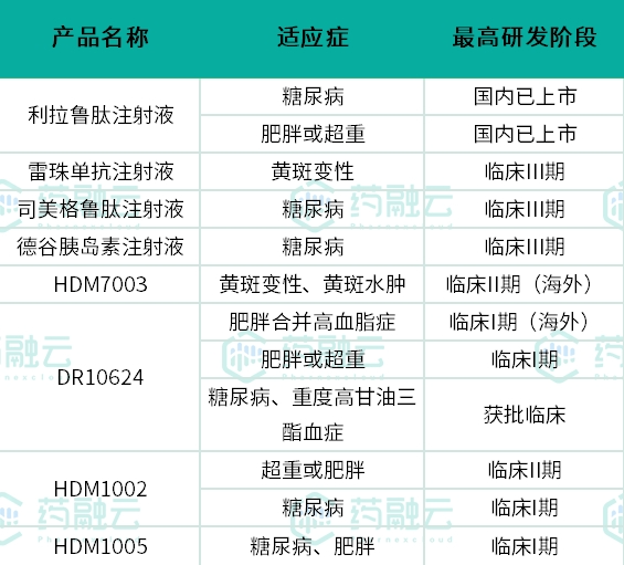 雷珠单抗注射液、司美格鲁肽注射液和德谷胰岛素注射液均已进入临床III期阶段,今年3月,诺和诺德利拉鲁肽制备方法专利被华东医药挑战成功。HDM1002、DR10624、HDM1005等管线也处于临床阶段。