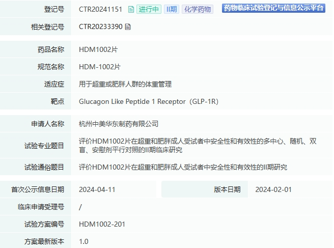 HDM1002片是华东医药自主研发并拥有全球知识产权的1类化药新药,是具有口服活性、强效、高选择性的 GLP-1 受体小分子完全激动剂。其糖尿病适应症已于2023年5月首获中美双IND批准,并于2023年6月初实现首例受试者用药(FIH)。肥胖适应症的中国IND申请最早于2023年9月获批,现已迈入临床II期阶段。