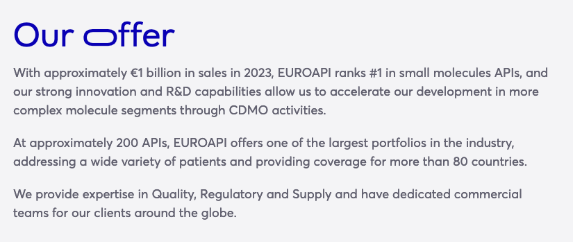 现阶段EuroAPI公司拥有约3450名员工。拥有约200个API产品,是欧洲业内最大的产品组合之一,为80多个国家的客户提供原料药产品和技术服务,同时开发创新药分子的CDMO服务。