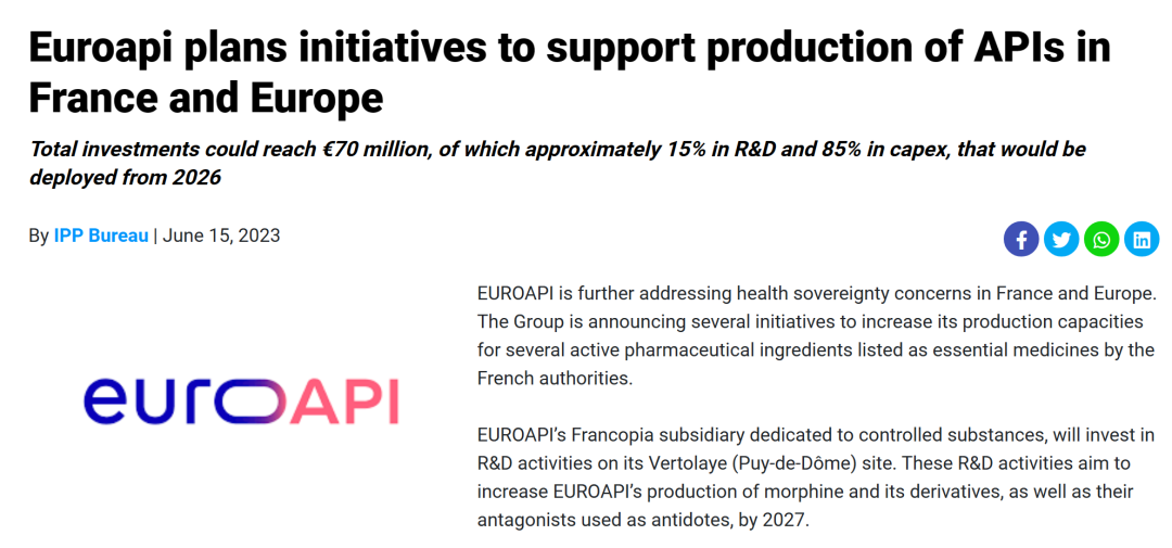 2024年起,公司未来将聚焦于⾼度差异化和有潜力的盈利的原料药产品,包括多肽、寡核苷酸(收购了BianoGMP);激素、前列腺素类;阿片和管控类等等。作为法国本土的公司,EuroAPI此前在2023年6月15日表示:计划支持法国和欧洲的原料药生产。(维护本土供应链稳定性)