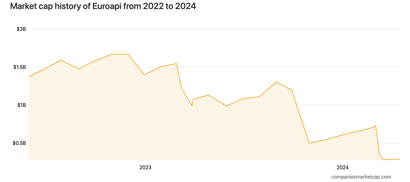 据药融云数据监测显示:EuroAPI(EAPI.PA),近期市值下跌至约合2.8亿美元。一年内的涨跌幅为-74.46%;当然离最高峰也相去甚远。