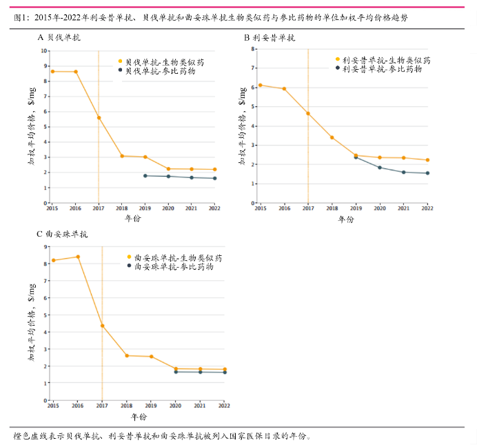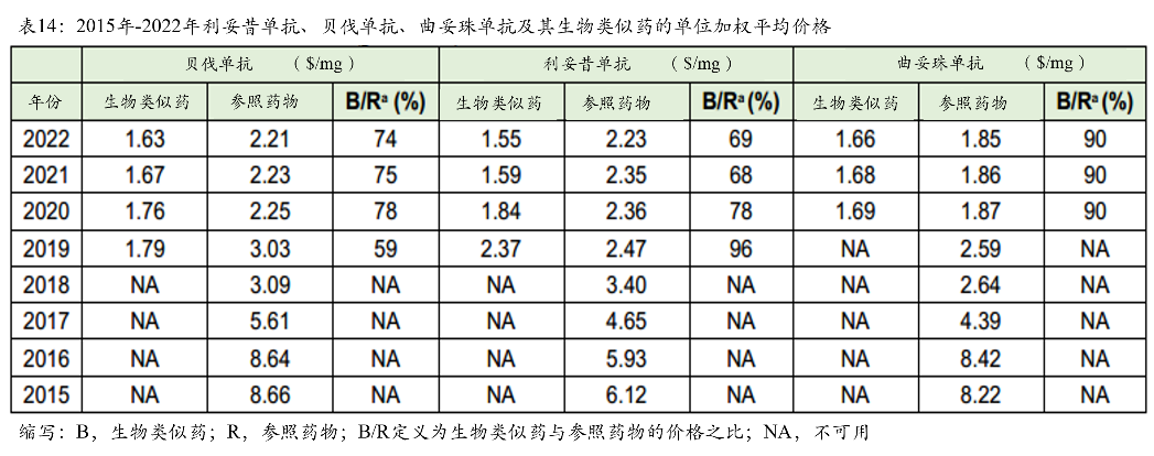 2015年-2022年利妥昔单抗、贝伐单抗和曲妥珠单抗生物类似药与参比药物的单位加权平均价格趋势