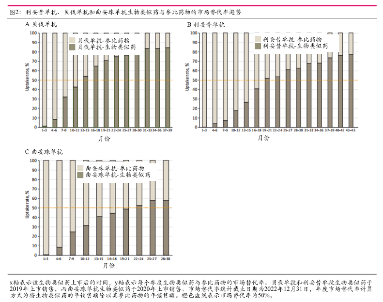 利妥昔单抗、贝伐单抗和曲妥珠单抗生物类似药与参照药物上市后的市场替代率趋势