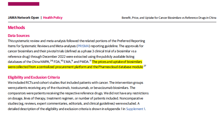 附:《Clinical Benefit, Price, and Uptake for Cancer Biosimilars vs Reference Drugs in China:A Systematic Review and Meta-Analysis》(中国肿瘤生物类似药相比于参照药的临床获益、价格和市场替代的评价分析)全文下载地址: https://jamanetwork.com/journals/jamanetworkopen/fullarticle/2810581