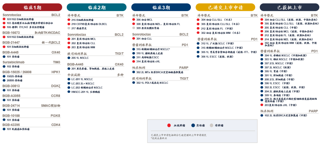 目前共有 3 款自主研发并获批上市药物,包括百悦泽(泽布替尼,一款用于治疗多种血液肿瘤的布鲁顿氏酪氨酸激酶(BTK)小分子抑制剂)、百泽安(替雷利珠单抗,一款用于治疗多种实体瘤及血液肿瘤的抗 PD-1 抗体免疫疗法)和百汇泽(帕米帕利,一款具有选择性的PARP1 和 PARP2 小分子抑制剂)。百悦泽已在美国、中国、欧盟、英国、加拿大、澳大利亚等70 个国家和地区获批上市,百泽安已在中国、欧盟和美国获批上市,百汇泽也已在中国上市。通过利用公司强大的商业化能力,获授权许可在中国市场商业化另外 14 款已获批药物。据兴业证券统计,2024替雷利珠单抗催化剂有:1、FDA 1L ESCC预期获批,2024年7月PDUFA;2、欧洲24H1递交1L ESCC和1L胃癌上市申请;3、FDA 1L 胃癌,2024年12月PDUFA。