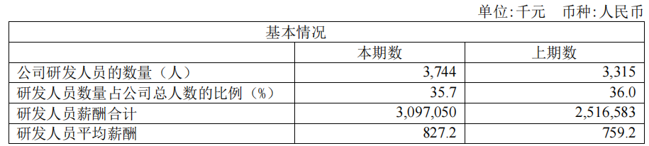 截止2023 年末公司拥有将近 10,500 名员工,相对2022年底的9000人,增加约1500人。截止2023年末,公司拥有研发人员3744人,占总人数比拟为36%;研发人员平均薪酬约为83万元,同比增加9%。去年研发人员薪酬合计为31亿元。