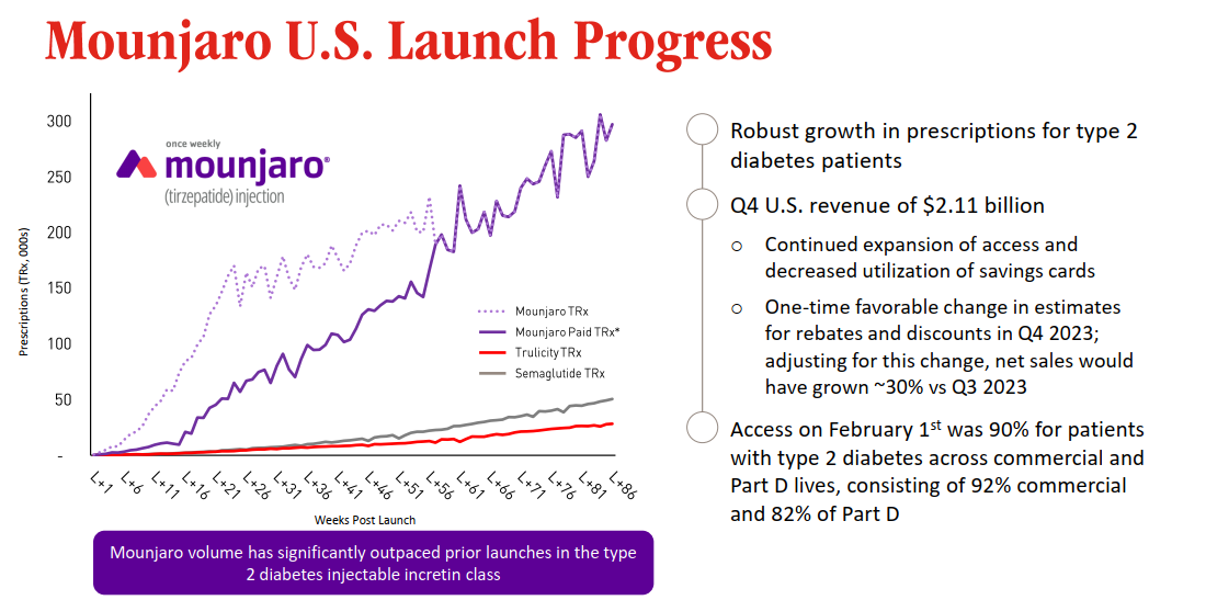 由于减肥适应症的Zepbound强劲需求,短缺将持续到2024年4月底。根据2月份披露的2023年度财报,2023年替尔泊肽降糖适应症的Mounjaro销售额为51.63亿美元,同比增加970%;替尔泊肽减肥适应症Zepbound,产生了1.76亿美元的收入(不到一个月时间,12月5日正式推出市场,患者可及)。