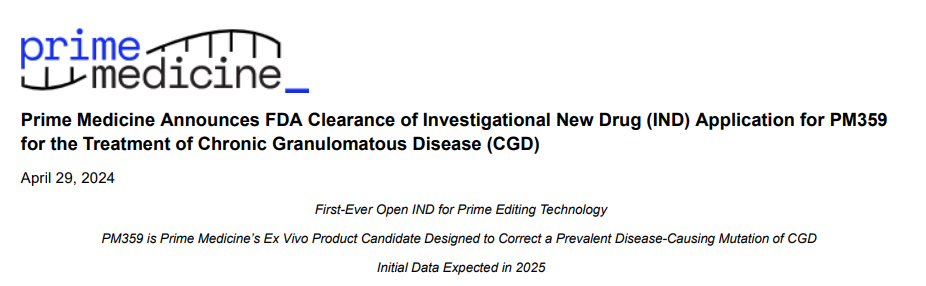 4月30日,由知名基因编辑专家刘如谦教授创立的领先基因编辑公司Prime Medicine宣布,该公司为在研先导编辑(prime editing)疗法PM359递交的IND申请已经获得美国FDA的许可,用于治疗慢性肉芽肿病(CGD)。这使该公司能够启动全球性的1/2期临床试验。