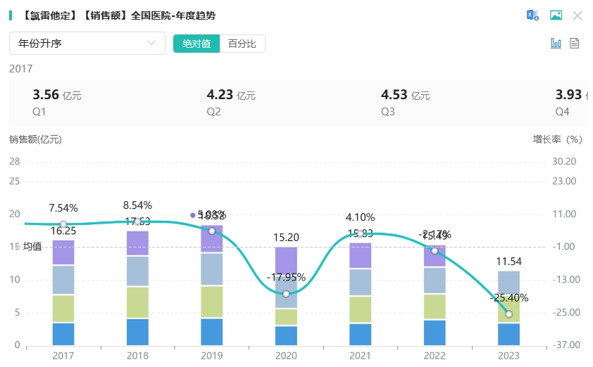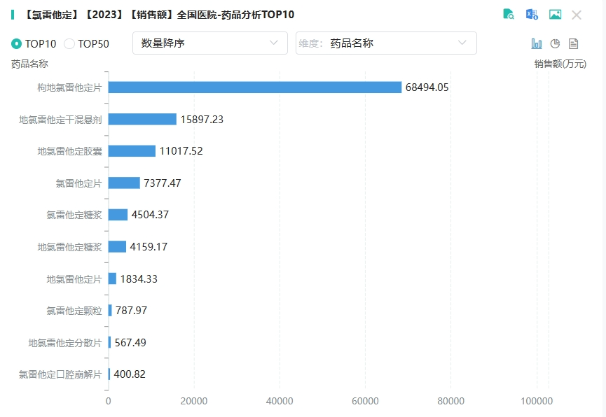 从在全国院内市场来看,氯雷他定相关品种的销售表现尤为亮眼。其总销售峰值超18亿元,显示出强大的市场潜力。2023年(截至Q3),氯雷他定相关品种的销售额已接近12亿元,表明其在抗过敏药物市场应用前景乐观。