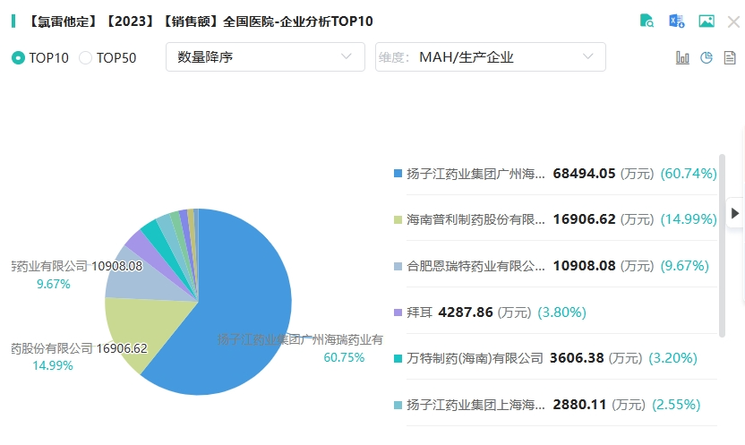 氯雷他定相关品种,从企业方面来看,2023年在全国院内市场TOP10榜单中,扬子江药业以显著优势占据近6成市场份额,稳居领先地位。紧随其后的是海南普利制药,以近15%的市场份额紧随其后,展现了强劲的竞争实力。合肥某企业则以9.67%的市场份额位列第三,同样在市场中占据一席之地。