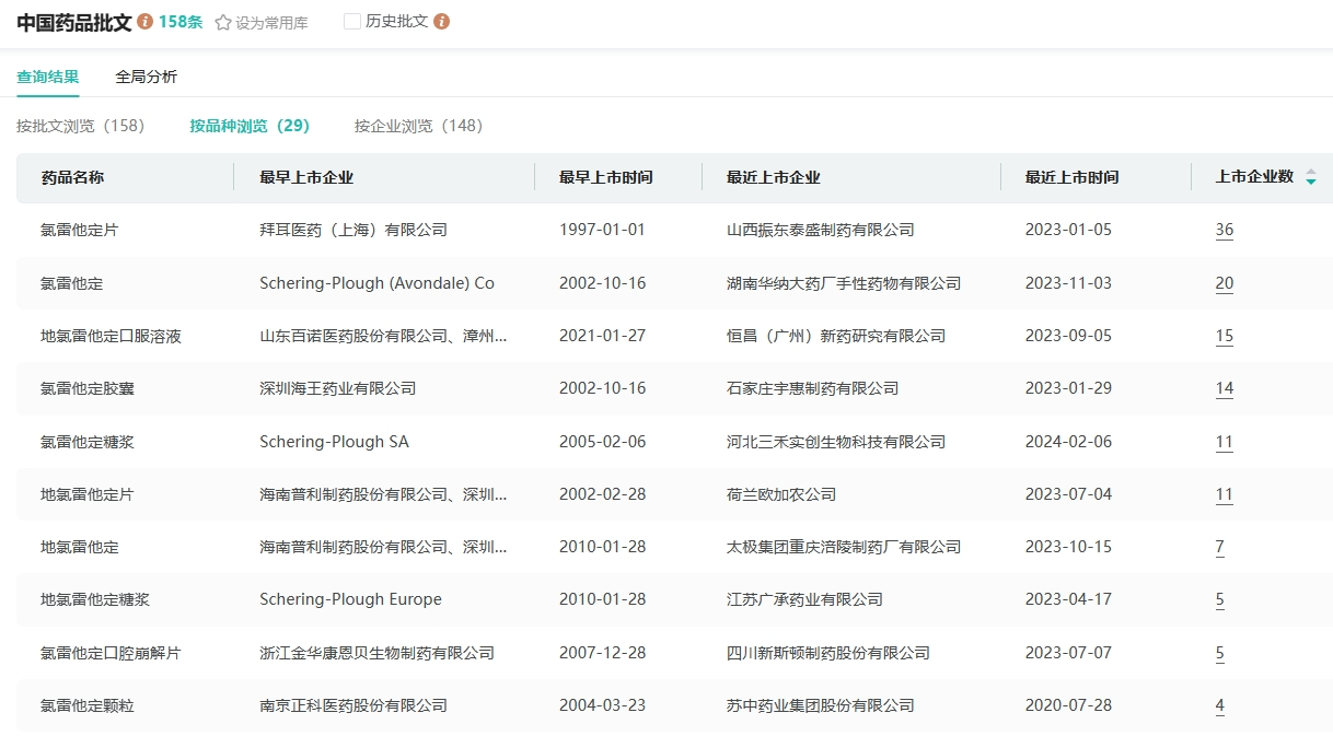 在国内市场,多家药企也争先布局。据药融云数据统计,目前有153条氯雷他定的生产批文,生产企业超100家,包括北京双鹭、常州四药制药、正大天晴药业等。