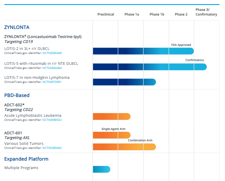 ADC的Zynlonta已经在美国和欧盟被批准用于三线复发或难治性大B细胞淋巴瘤、低级别淋巴瘤引起的弥漫性大B细胞淋巴瘤和高级别B细胞淋巴瘤。