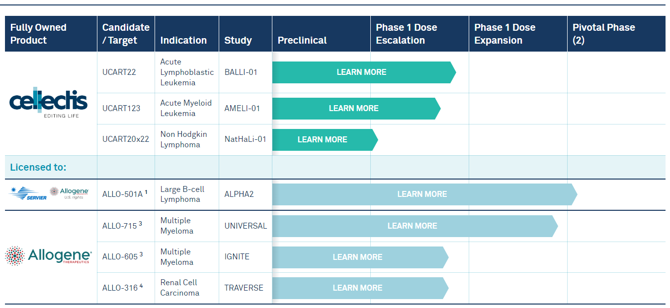 Cellectis,1999年成立,总部位于法国巴黎,专注开发以基因编辑T细胞为基础的免疫肿瘤产品,用于靶向和根除癌症。目前,Cellectis公司自主在研的CAR-T产品有3个,均针对血液系统恶性肿瘤,其中UCART123和UCART22处于I期临床。