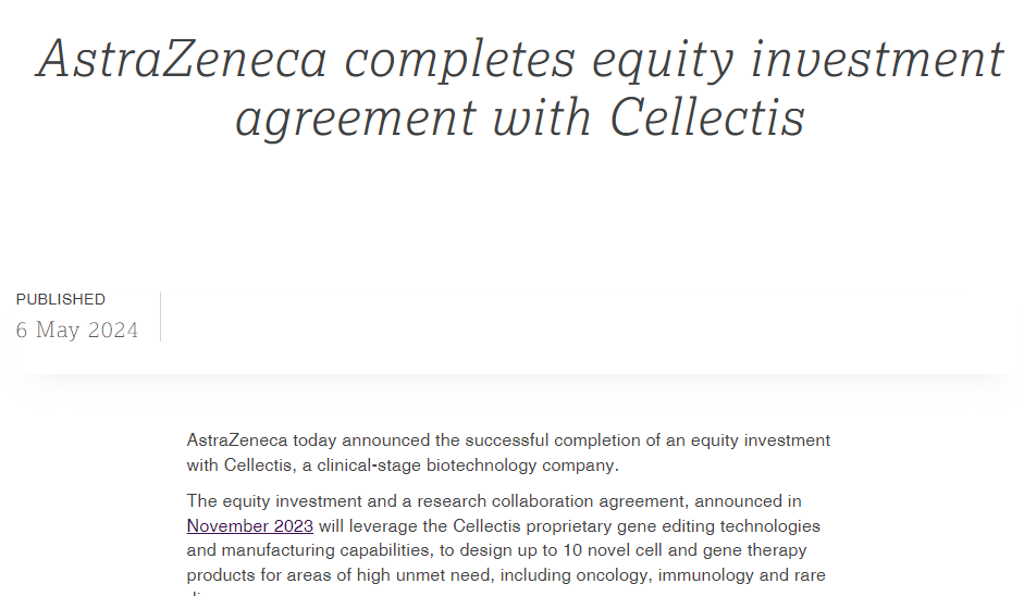 近期,阿斯利康宣布增投1.4亿美元,获得Cellectis公司44%的股份,以进一步支持此前投资10款细胞与基因疗法的研发。(相关阅读:投资4.75亿美元!阿斯利康在无锡新建小分子创新药工厂)