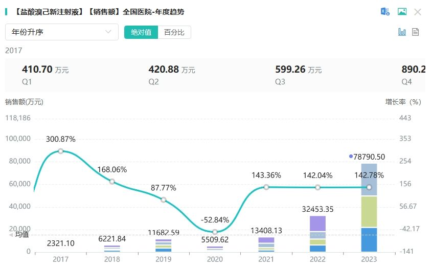 盐酸溴己新注射液为2021版国家医保目录品种。主要用于在口服给药困难的情况下,慢性支气管炎及其他呼吸道疾病如哮喘、支气管扩张、矽肺等有粘痰不易咳出的患者。据药融云数据统计,盐酸溴己新注射液在2022年全国院内市场销售额超3亿元,同比增长达142%,2023年(截止Q3)全国院内市场销售额超7亿元。