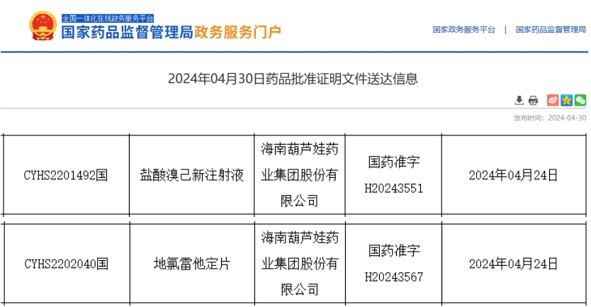 近期,据NMPA官网公示,海南葫芦娃药业集团的盐酸溴己新注射液和地氯雷他定片获批上市。据药融云数据统计,目前海南葫芦娃药业已有16个品种过评。