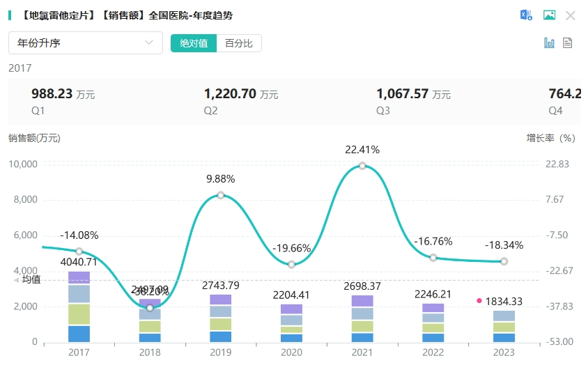 地氯雷他定片用于缓解慢性特发性荨麻疹及常年性过敏性鼻炎的全身及局部症状。据药融云数据统计,地氯雷他定片2022年在全国院内销售额达2千万。