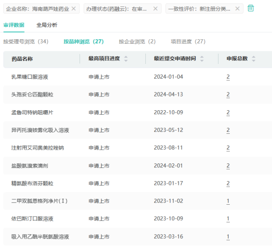 在仿制药布局方面,海南葫芦娃药业提交了头孢妥仑匹酯颗粒、孟鲁司特钠咀嚼片、注射用艾司奥美拉唑钠、盐酸氨溴索滴剂、二甲双胍恩格列净片(Ⅰ)等27个品种的仿制申请,均在审评审批中。
