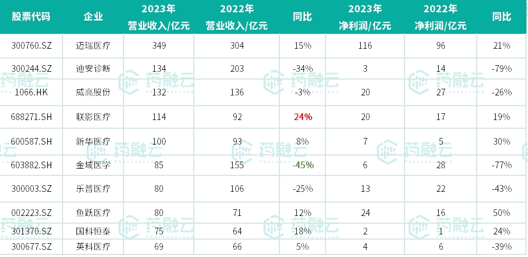 医疗器械领域,2023年营收前三甲分别是迈瑞医疗、迪安诊断和威高股份。