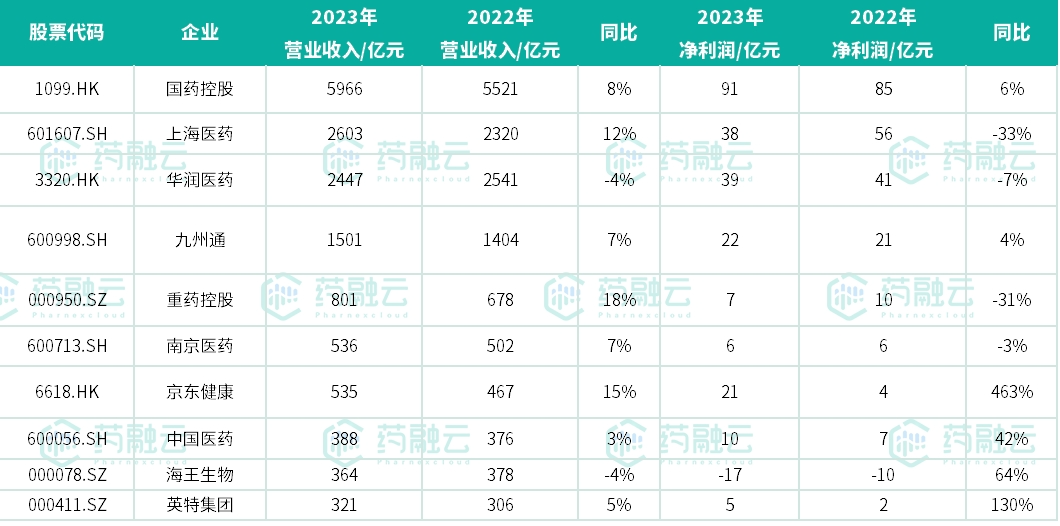 医药商业领域,2023年营收前三甲分别是国药控股、上海医药和华润医药。医药商业领域企业营收基数大,增速相对平稳。