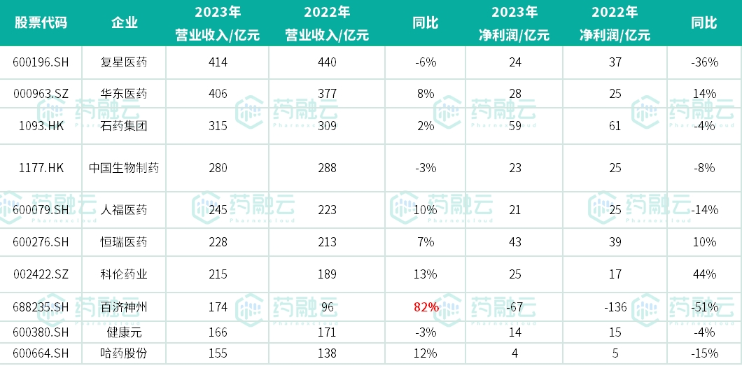 化学制药领域,2023年营收前三甲分别是复星医药、华东医药和石药集团,都是“Big Pharma”,有着强大的销售体系和产品梯队,既有拳头产品提供现金流,也在快速的创新转型。(相关阅读:华东医药2024年Q1财报:实现营业收入104.11亿元,同比增长2.93%)