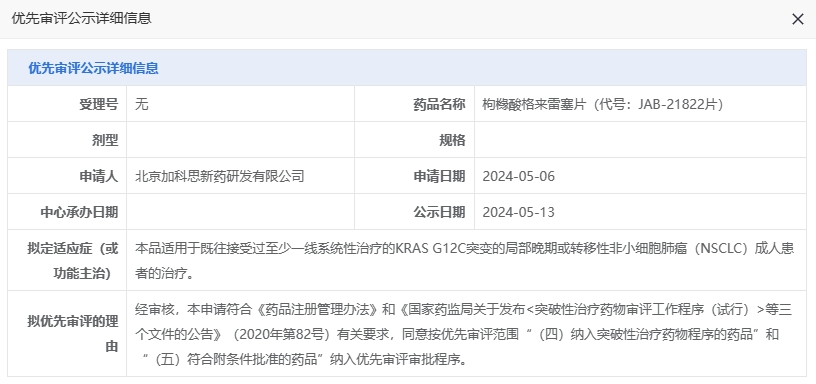 5月13日,据CDE官网公示,加科思申报的枸橼酸格来雷塞片拟纳入优先审评,适用于既往接受过至少一线系统性治疗的KRAS G12C突变的局部晚期或转移性非小细胞肺癌(NSCLC)成人患者的治疗。