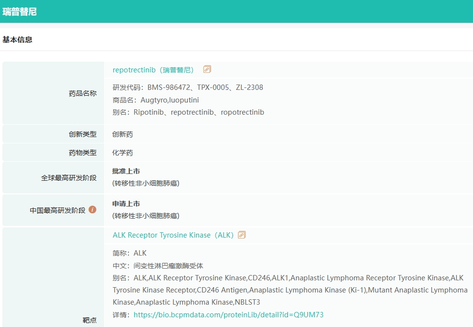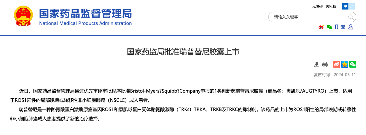 5月11日,据NMPA官网公示,由百时美施贵宝公司和再鼎医药申报的1 类创新药瑞普替尼胶囊上市申请已在中国获批,适用于ROS1阳性的局部晚期或转移性非小细胞肺癌(NSCLC)成人患者。