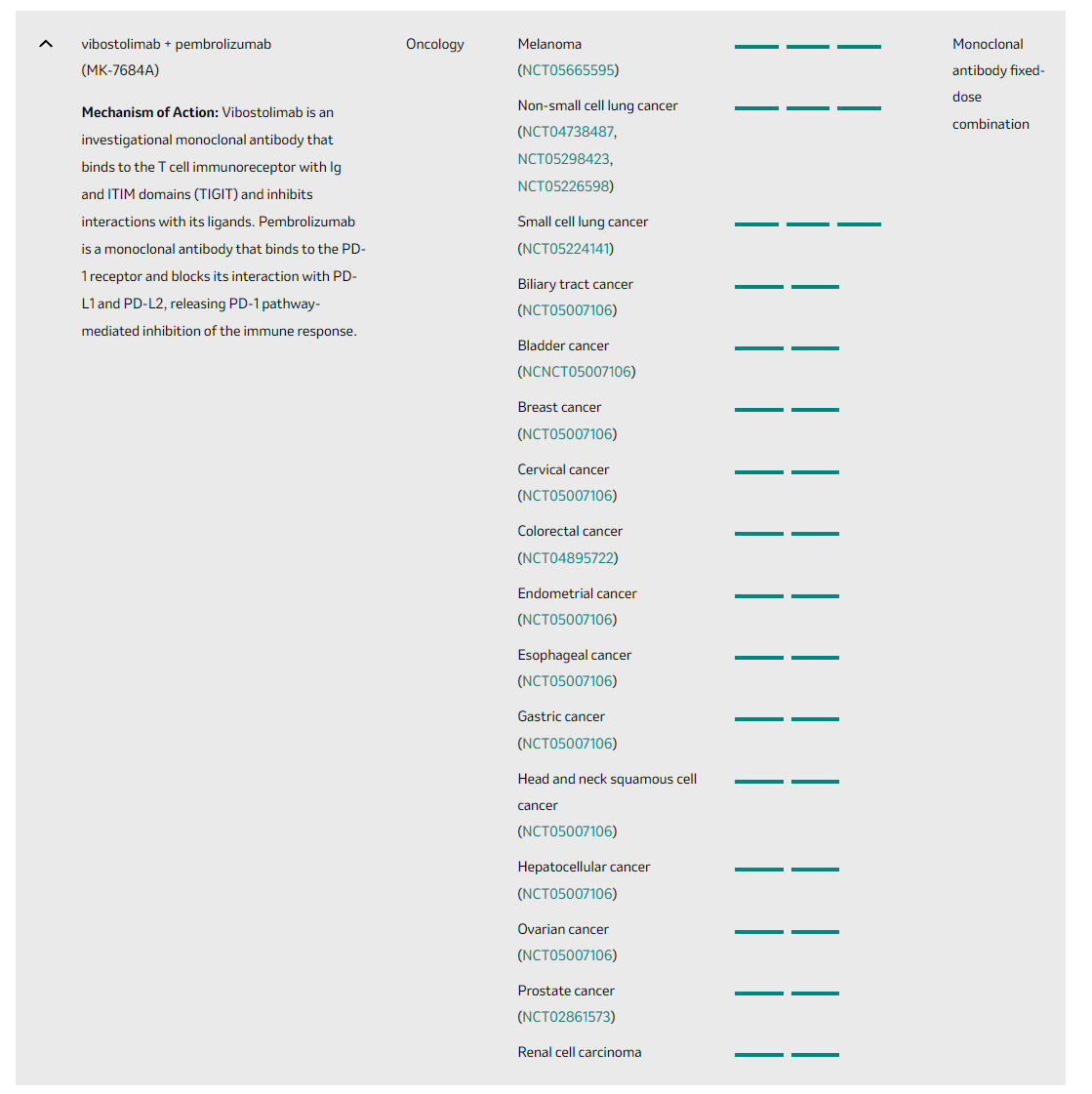 Vibostolimab(MK-7684)是默沙东研发的一种人源化抗TIGIT抗体,通过阻断TIGIT受体与其配体结合,恢复抗肿瘤活性,激活T淋巴细胞以破坏肿瘤细胞。目前,Vibostolimab与pembrolizumab的联合制剂正在肺癌、其他实体瘤和血癌等多种癌症中进行评估。