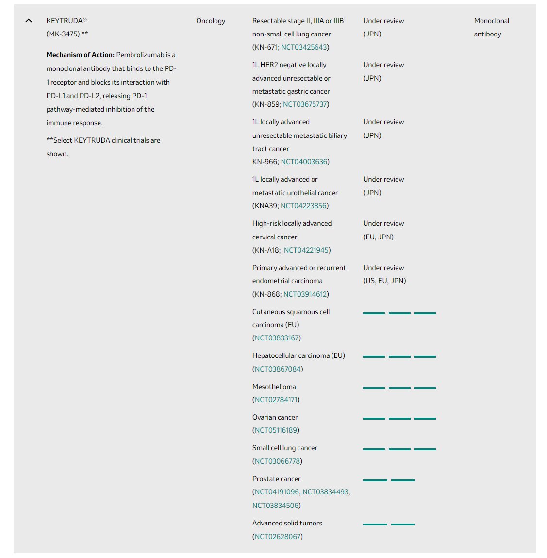 KEYTRUDA(pembrolizumab)注射液是一种PD-1疗法,通过增强人体免疫系统检测和对抗肿瘤细胞的能力来发挥作用。KEYTRUDA可阻断PD-1与其配体PD-L1和PD-L2的相互作用,从而激活T淋巴细胞,这些细胞可能影响肿瘤细胞和健康细胞。目前,默沙东有超过1,600项试验正在各种癌症和治疗环境中研究KEYTRUDA,旨在深入了解其在癌症中的作用以及预测患者从KEYTRUDA治疗中受益的潜在因素,包括探索不同的生物标志物。