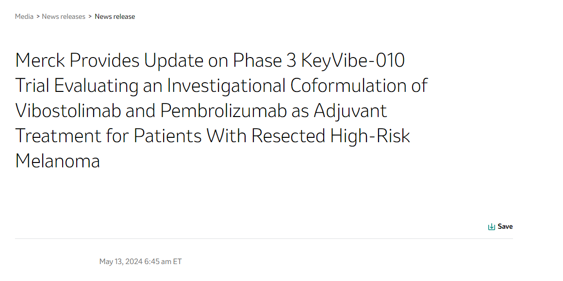 5月13日,默沙东(纽约证券交易所股票代码:MRK)公布,由于免疫副作用引发的大量患者退出,该公司决定中止正在进行的3期KeyVibe-010试验中针对皮肤癌患者的治疗。此次中止涉及的是vibostolimab(一种抗TIGIT药物)与帕博利珠单抗(抗PD-1药物,又称pembrolizumab)的联合制剂组。该联合制剂原本旨在作为高风险黑色素瘤(ⅡB-Ⅳ期)患者手术切除后的辅助治疗,并与单独使用帕博利珠单抗的治疗效果进行对比评估。