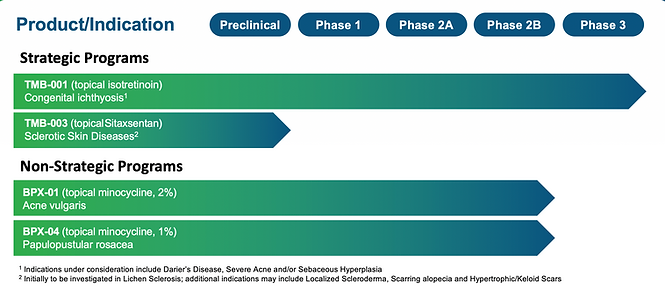 TMB-001是一种活性药物成分(API)为异维甲酸/异维A酸的研究性外用制剂(改良新药),目前美国只有异维甲酸的口服制剂。该新制剂已获得FDA的孤儿药项目资质;快速通道和突破性疗法的认证。TMB-001在II期临床研究已显示出积极的结果,III期临床研究的招募工作目前正在美国和欧洲进行。
