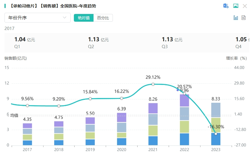 马来酸氟伏沙明片由雅培制药研发,作为一种选择性5-HT再摄取抑制剂,适用于抑郁症及相关症状的治疗以及强迫症症状的治疗,是国家医保目录乙类品种。1994年在美国获批,2000年进入中国。据药融云数据统计,马来酸氟伏沙明片在2022年全国院内销售额达4.39亿元,同比增长达25.6%。2023年(截止Q3)其销售额已突破4亿元,接近2022年全年销售额,市场表现极为强劲。