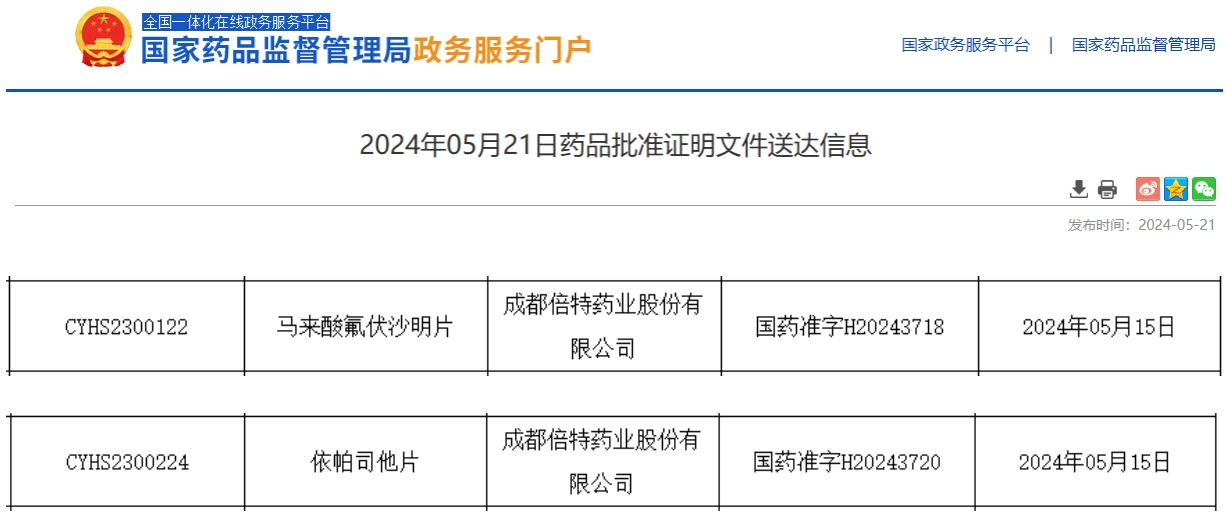 5月21日,据NMPA官网公示,成都倍特药业提交的2款仿制化药马来酸氟伏沙明片和依帕司他片同日获批上市并视同过评。据药融云数据统计,今年(截止5月21日)成都倍特药业已有11个品种过评。