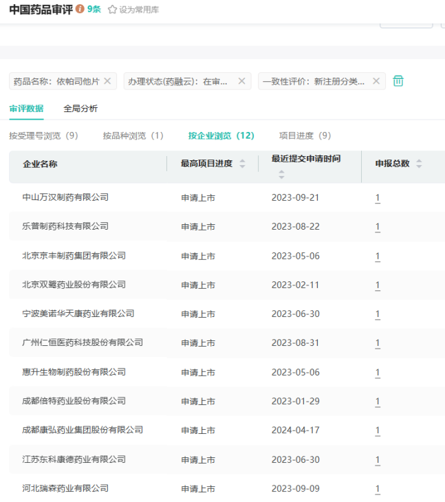 除倍特药业,依帕司他片目前有北京双鹭药业、乐普制药、中山万汉制药、惠升生物制药等11家药企提交了仿制申请,均在审评审批中。