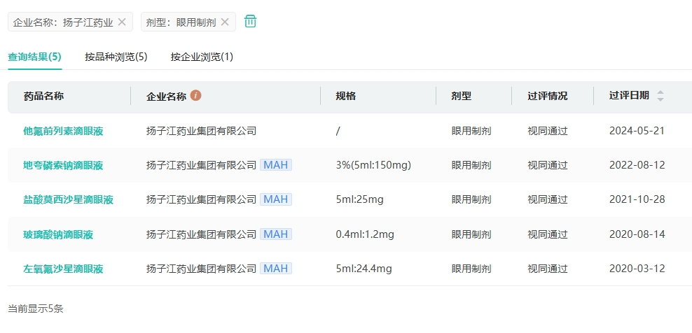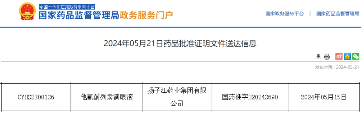 5月21日,据NMPA官网公示,扬子江药业的4类仿制化药他氟前列素滴眼液获批并视同过评。据药融云数据库统计,今年(截止5月22日)扬子江药业有7个品种过评。