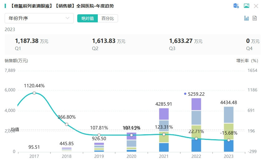 近年来,他氟前列素滴眼液市场快速放量。据药融云数据统计,他氟前列素滴眼液在2022年全国院内销售突破5千万元,同比增长近23%。2023年(截止Q3)全国院内销售额超4千万元。