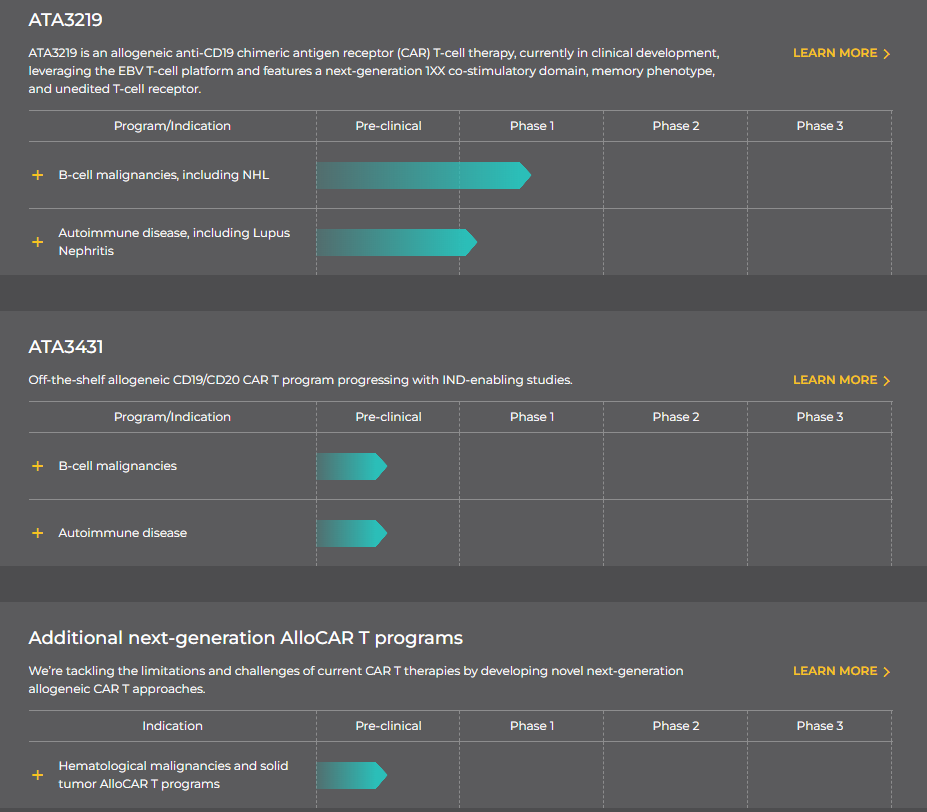 Atara Biotherapeutics于2012年8月成立,是一家领先的现成同种异体T细胞免疫治疗公司,为癌症、自身免疫性疾病和病毒性疾病患者开发新型治疗方法。Atara最先进的T细胞免疫疗法是tabelecleucel。而Tab-cel还开发了用于B细胞淋巴瘤的同种异体CAR-T疗法ATA3219、ATA3431以及用于多发性硬化症的现货型T细胞疗法ATA188。其中,ATA3219于今年3月份获得FDA批准用于治疗狼疮性肾炎的IND申请,成为全球首个自免适应症获批临床的通用型CAR-T疗法。这是ATA3219继非霍奇金淋巴瘤(NHL)后获得的第二个IND批件。