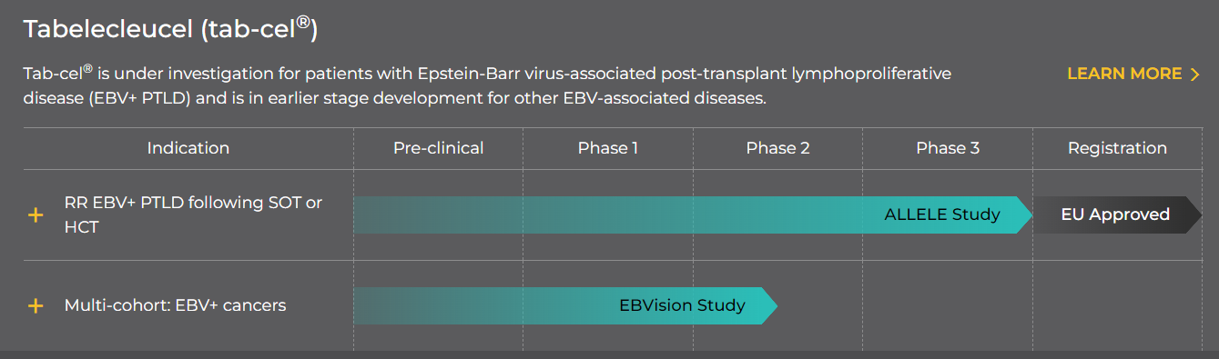 目前,Tab-cel 已获得美国 FDA 授予治疗利妥昔单抗难治性 EBV 阳性PTLD的突破性疗法以及孤儿药认定。