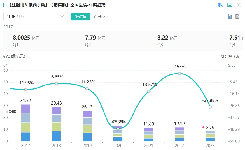 注射用头孢西丁钠作为一款备受信赖的头孢类抗菌药物,专门用于治疗对本品敏感的细菌所引发的多种感染。其适应症广泛,涵盖上下呼吸道感染、泌尿道感染(含无并发症的淋病)、腹膜炎、腹腔内及盆腔内感染、败血症(含伤寒)、妇科感染、骨与关节软组织感染以及心内膜炎等。据药融云数据统计,注射用头孢西丁钠在2022年全国院内销售额超12亿元,同比增长达2.55%,注射用头孢西丁钠在2023年(截止Q3)全国院内销售额近9亿元,显示出强劲的市场需求和广泛的应用前景。