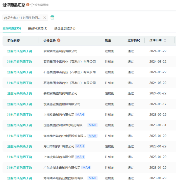 注射用头孢西丁钠在国内已有安徽省先锋制药、上海上药新亚药业、广州白云山医药集团、四川制药制剂、石药集团中诺药业等超60家药企拥有生产批文,其中过评的有石药集团中诺药业、安徽省先锋制药、山东鲁抗医药、四川制药制剂、扬子江药业、悦康药业等18家药企。