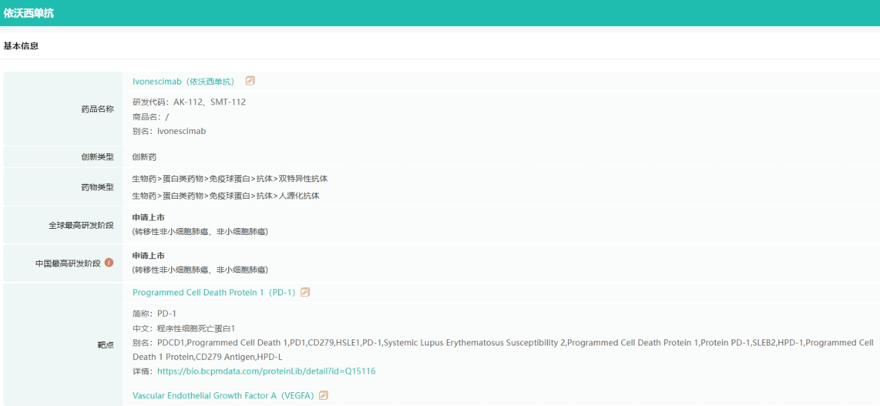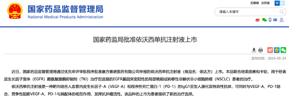 5月24日,据NMPA官网正式公告,康方生物的依沃西单抗(AK112/Ivonescimab)已获准在国内上市。这款新药将成为全球首款融合“肿瘤免疫+抗血管”双重机制的双特异性抗体药物,其治疗范畴主要涵盖那些经过EGFR酪氨酸激酶抑制剂(EGFR-TKI)治疗后病情进展的、携带有EGFR突变的局部晚期或转移性非鳞非小细胞肺癌(NSCLC)患者。该品种的上市为NSCLC患者提供了新的治疗选择。