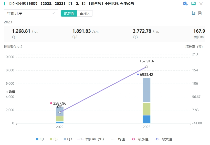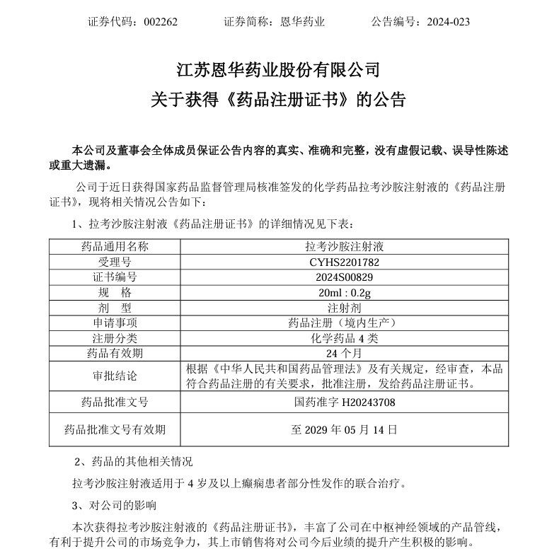 5月24日,据江苏恩华药业公告显示,该公司以仿制4类报产的拉考沙胺注射液获批上市。据药融云数据统计,该品种在2023年(截止Q3)全国院内市场销售额超6千万元。
