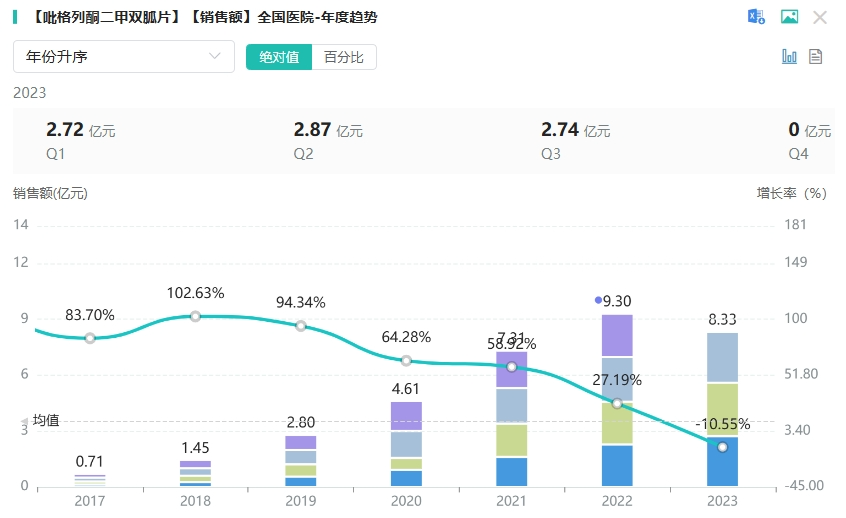 吡格列酮二甲双胍片用于改善2型糖尿病人的血糖控制,适用于单独使用盐酸二甲双胍治疗效果不佳的病人,以及使用盐酸吡格列酮和盐酸二甲双胍联合治疗的病人。据药融云数据统计,吡格列酮二甲双胍片在2022年全国院内市场销售额超9亿元,同比增长达27.19%。
