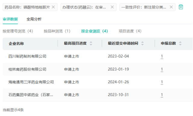 目前,磷酸特地唑胺片已有4家国内药企提交了4类仿制上市申请,包含石药集团中诺药业、海南通用三洋药业、桂林南药、四川制药制剂。