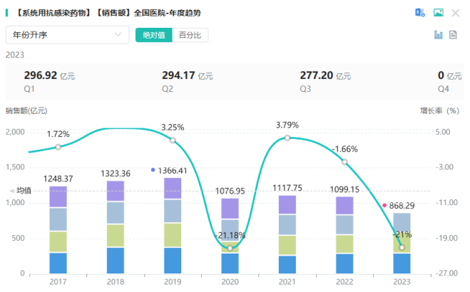 利奈唑胺,作为磷酸特地唑胺的“前辈”,市场表现一直不俗。在2019年,其院内销售额更是达到了峰值17.5亿元。而系统用抗感染药物在全国院内市场的销售峰值超1300亿元,随着磷酸特地唑胺片在国内市场的逐步推广和应用,这款超级抗生素在市的发展将值得期待。