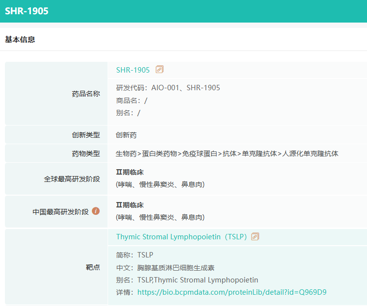 SHR-1905注射液是胸腺基质淋巴细胞生成素(TSLP)单克隆抗体,可以阻断炎症细胞因子的释放,抑制下游炎症信号的传导,最终改善炎症状态并控制疾病进展。经查询,目前国内外尚无同类药物获批用于慢性阻塞性肺疾病的治疗。截至目前,SHR-1905注射液相关项目累计已投入研发费用约7866万元。